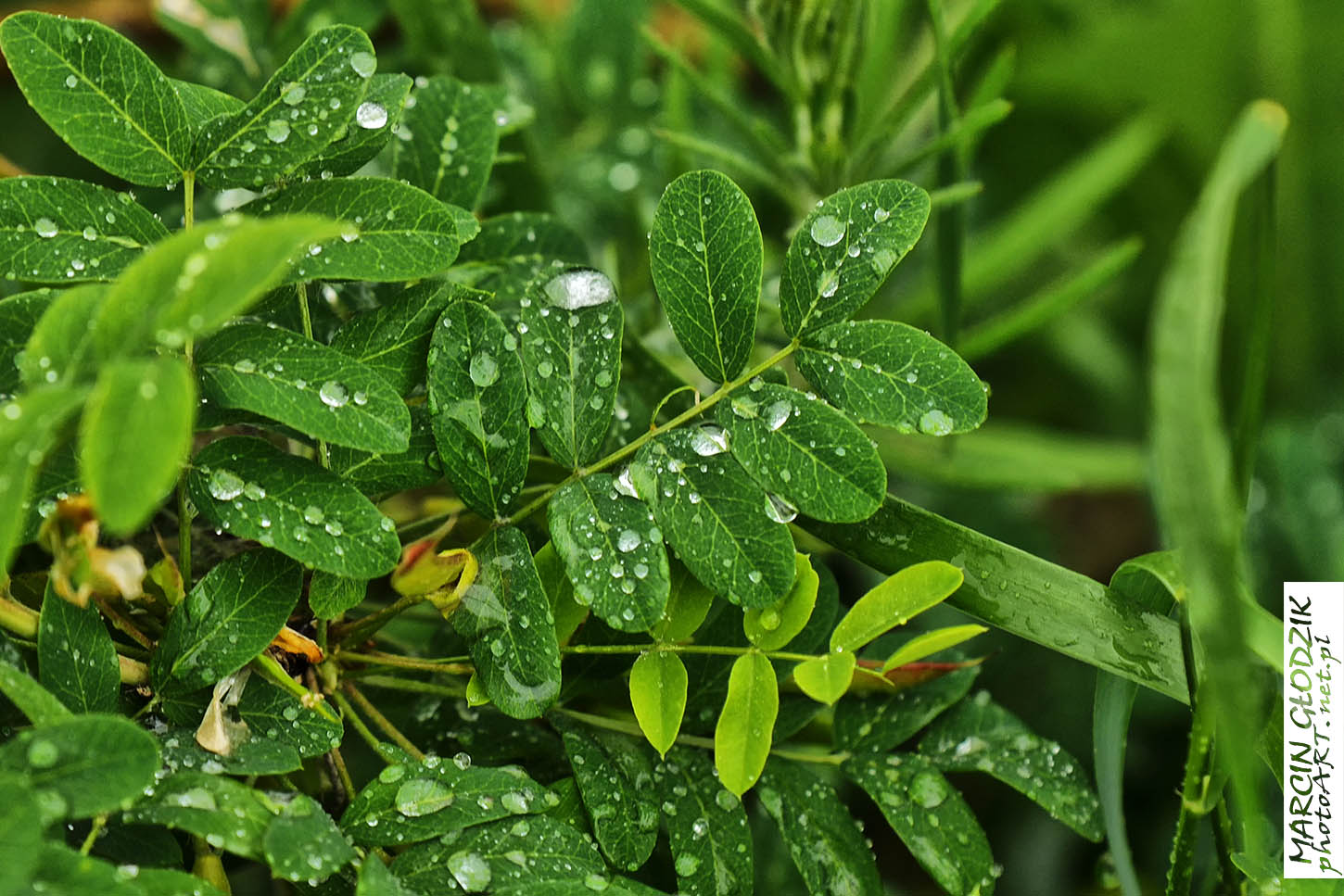 krople rosy na lisciach